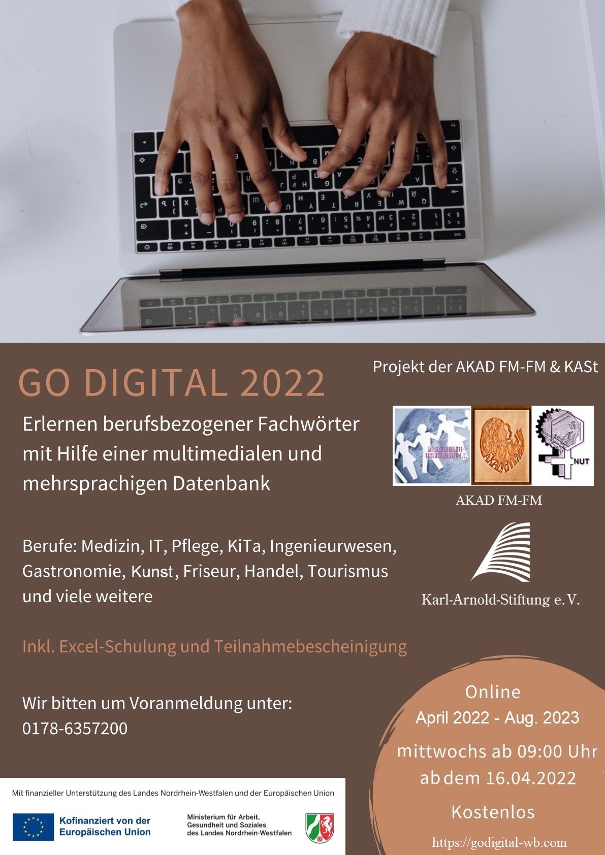 Das Projekt fördert digitale Kompetenzen und das Erlernen der deutschen Sprache im beruflichen Bereich für Teilnehmende mit Migrationsgeschichte. Hierfür wird eine bereits 2020 unter https://godigital-wb.com eingerichtete mehrsprachige Datenbank für berufsbezogene Fachwörter genutzt und weiter ausgebaut. In wöchentlichen Kursen werden die berufsbezogenen Sprachkompetenzen der Teilnehmenden verbessert und der Wortschatz der Datenbank in sechs Sprachen (Deutsch, Englisch, Persisch, Türkisch, Russisch und Arabisch) aus den Bereichen Medizin, Pflege, Ingenieurwissenschaften, IT, Kunst, KiTa,