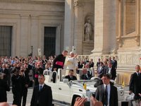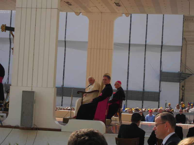 Früh los ging es am Mittwoch morgen zum Petersplatz. Ausgestattet mit den allerbesten Audienzkarten gelang es den Teilnehmenden, in der zweiten bis vierten Reihe direkt seitlich des Stuhls von Papst Benedikt XVI Platz zu nehmen und die Generalaudienz zu verfolgen. Der Papst nahm in verschiedenen Sprachen ausführlich Stellung zu seinem gerade absolvierten Deutschlandbesuch. Nachmittags fand dann der (für jeden Rombesucher zum Pflichtprogramm zählende) Besuch in den Vatikanischen Museen mit den Stanzen des Raffael und den Deckengemälden der Sixtinischen Kapelle und dem jüngsten Gericht statt. Von dort aus war es dann nicht mehr weit zum Petersdom, wo ein Rundgang in der eindrucksvollen Kirche den Tag abschloss.