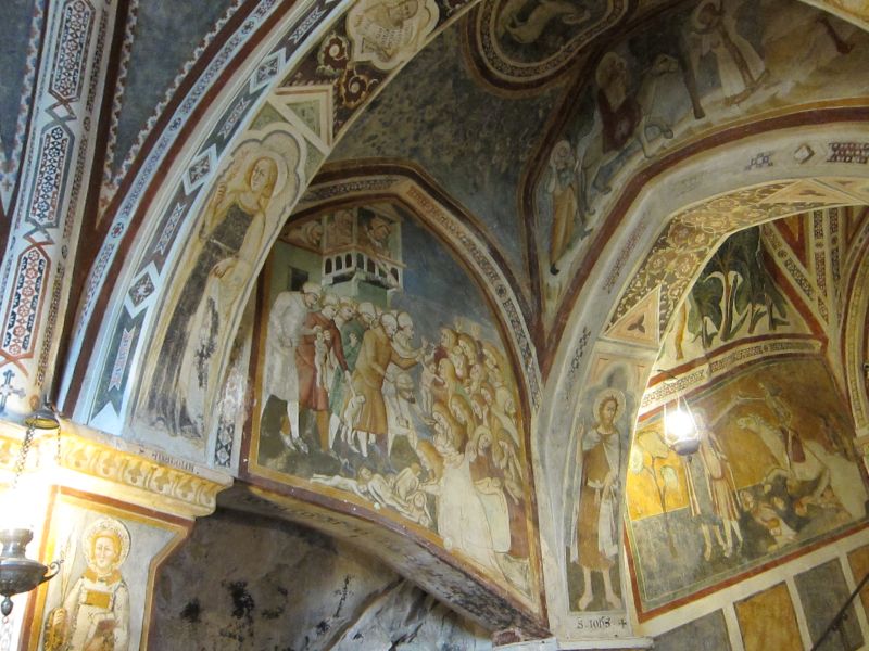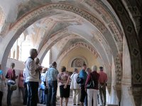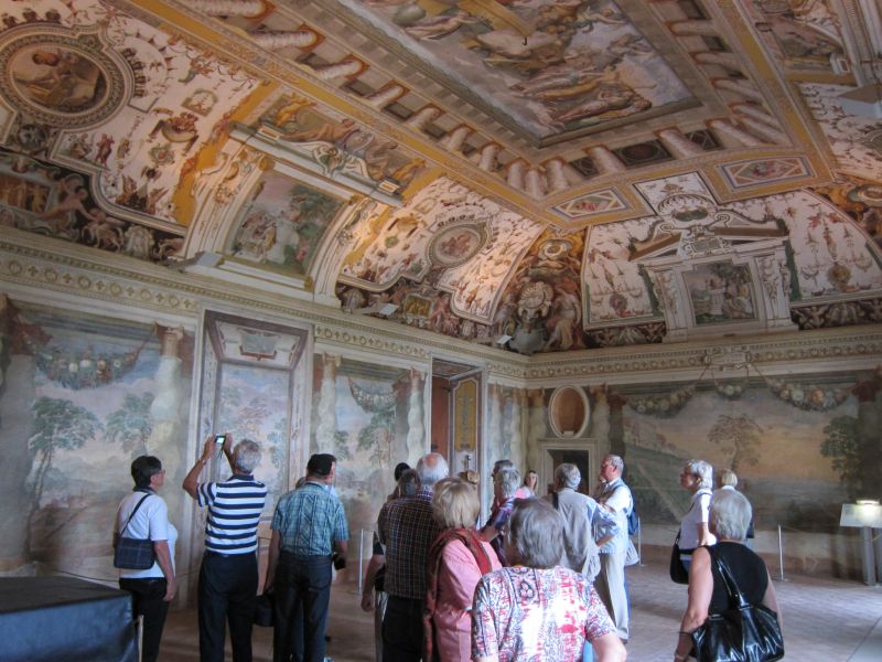 Sitzen und vom Bus aus die Landschaft genießen. Durchatmen in der frischen Bergluft Subiacos und die Ruhe und Abgeschiedenheit des Bergklosters San Benedetto („Sacro Speco“) genießen – das konnten die Teilnehmer am Dienstag. Die überreich mit Fresken aus dem 12. bis 15. Jahrhundert geschmückten Räume wurden anschaulich erklärt und die Legende des heiligen Benedikts und sein Lebensweg nachgezeichnet. Im Aniene-Tal wurden anschließend die drei Kreuzgänge der Klosteranlage besichtigt und in der klostereigenen Apotheke deckten sich die Teilnehmenden mit zahlreichen nützlichen Dingen ein. Am Nachmittag krönte die Besichtigung der herrlich ausgemalten Räume der Villa d’Este und ein Spaziergang durch die Gartenanlagen mit ihren zahlreichen beeindruckenden Wasserspielen den Tag.